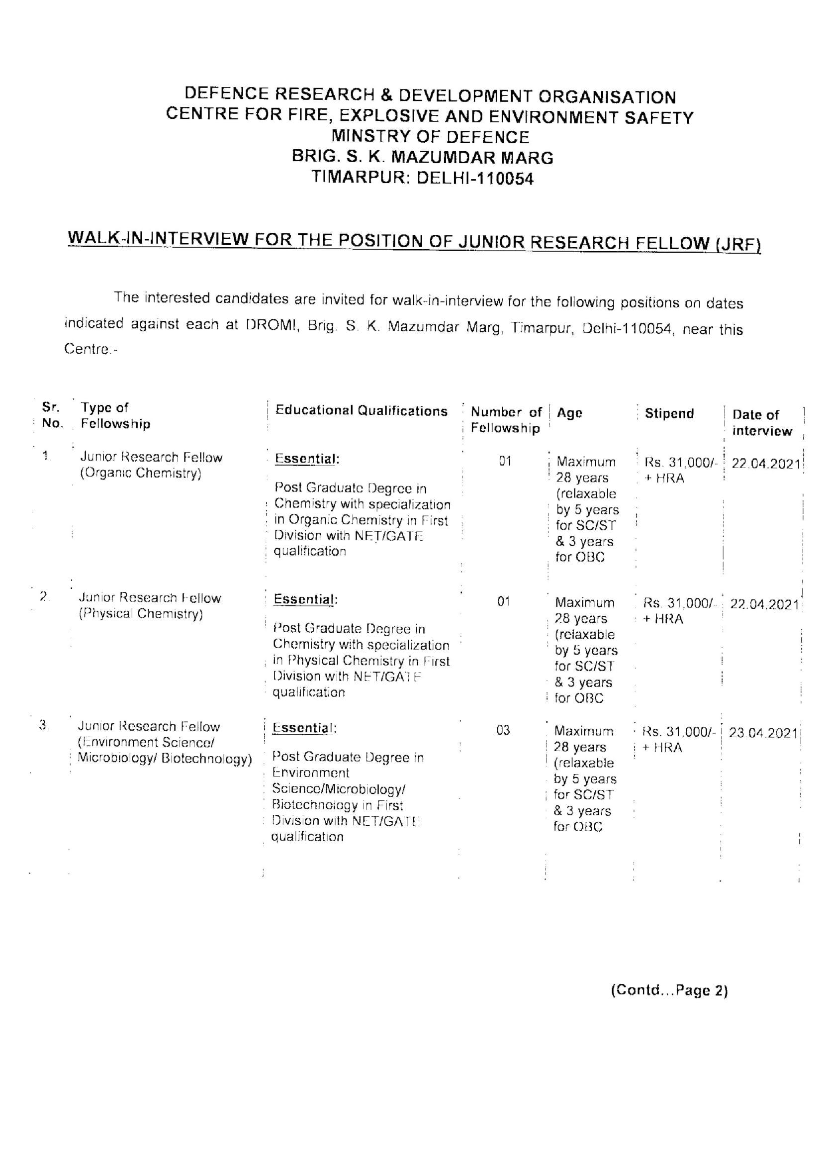 Applications are invited to Attend Walk-in-Interview for JRF under Defence Research & Development Organisation (DRDO) Center for fire, Explosive And Environment Safety, Ministery of Defence Brig. S. K. Mazumdin Marg Timarpur Delhi.