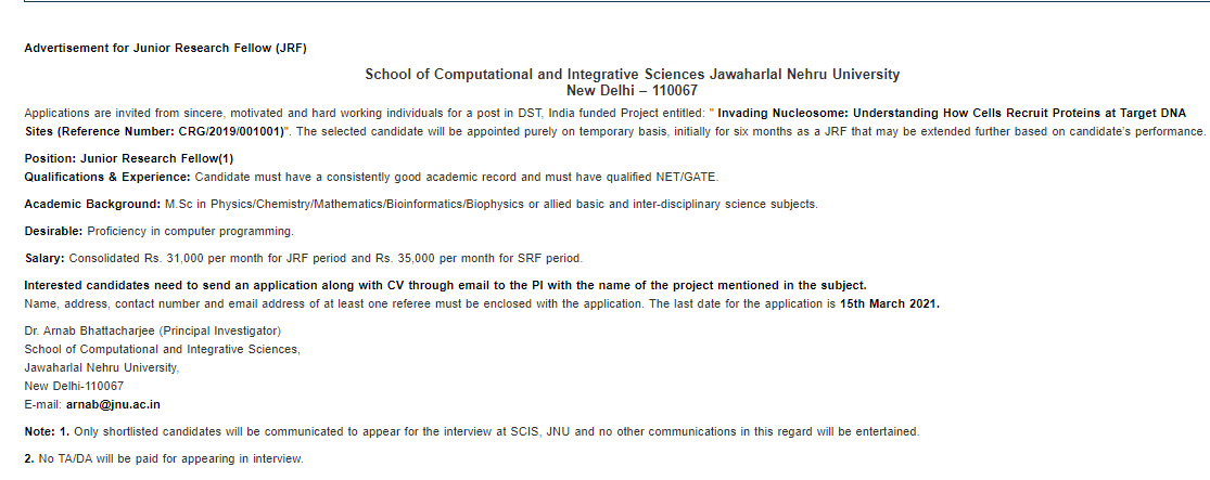 - Interested candidates need to send an application along with CV through email to the PI (Principal Investigator) Dr. Arnab Bhattacharjee ; e-mail: arnab@jnu.ac.in ,with the name of the project mentioned in the subject.