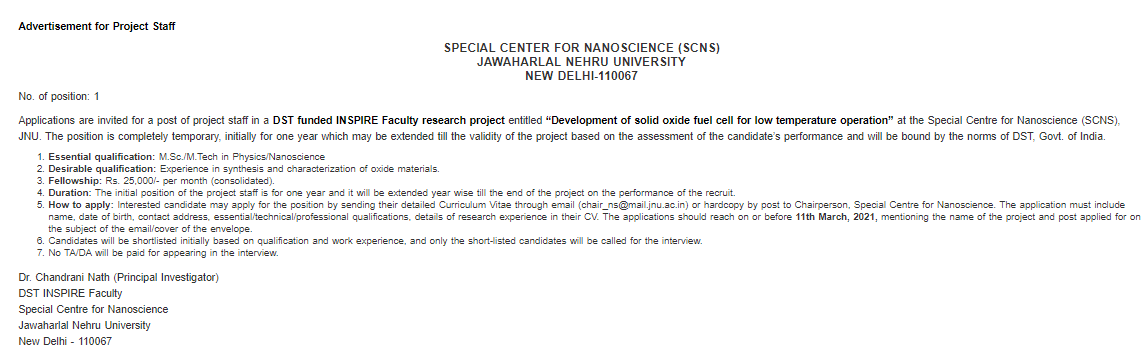 Applications are invited for the post of project staff in a DST funded INSPIRE Faculty research project at the Special Centre for Nanoscience (SCNS), Jawahar Lal Nehru University-Delhi.