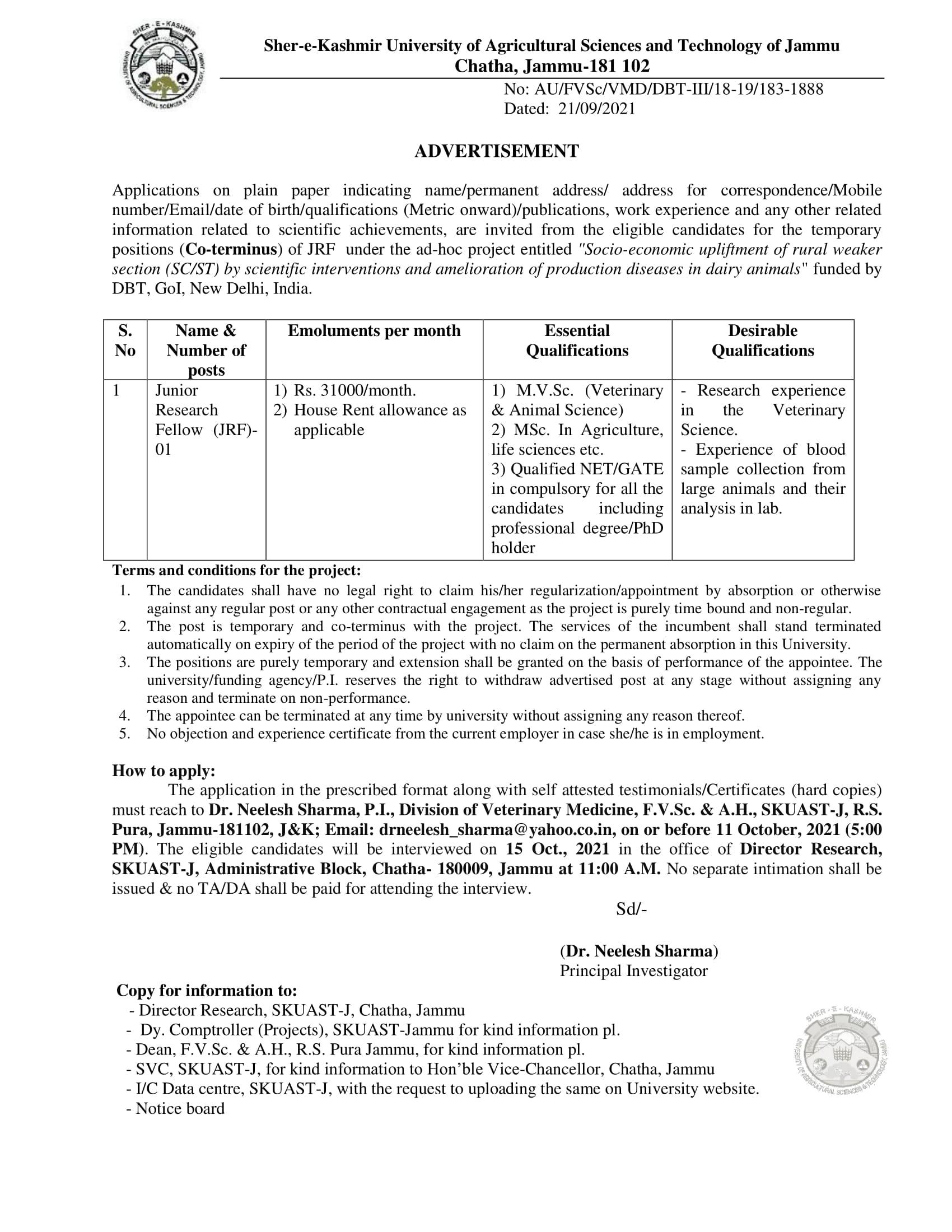 ? How to Apply - The application in the prescribed format along with self attested testimonials/Certificates (hard copies) must reach to Dr. Neelesh Sharma, P.I., Division of Veterinary Medicine, F.V.Sc. & A.H., SKUAST-J, R.S. Pura, Jammu-181102, J&K; Email: drneelesh_sharma@yahoo.co.in