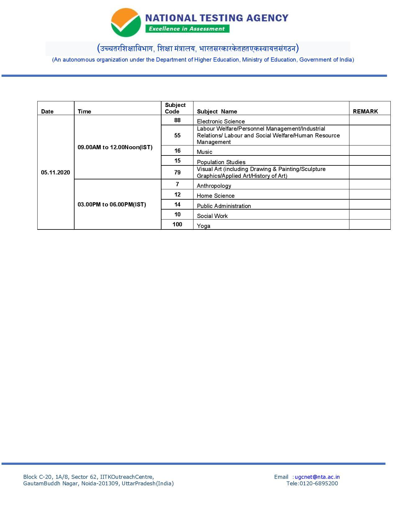 Subject Wise Schedule of UGC-NET June/Sept 2020 -